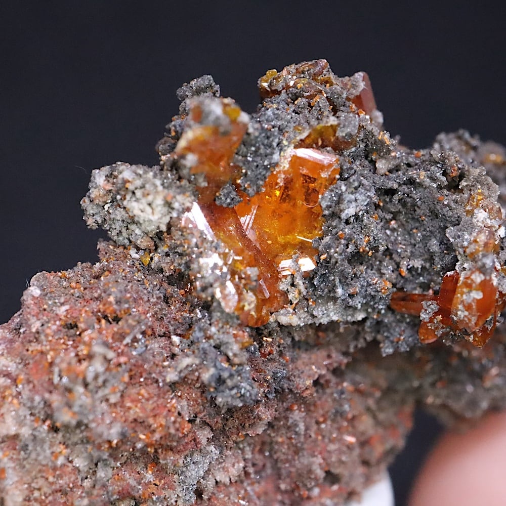 キャラメルオレンジの結晶のモリブデン鉛鉱(ウェルフェナイト)
