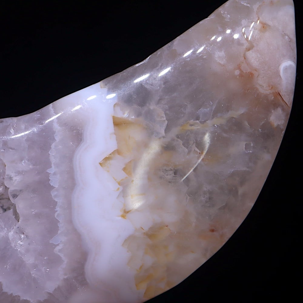 コロイド状の結晶を取り込んだめのうを磨いた際、模様が桜の花びらのように