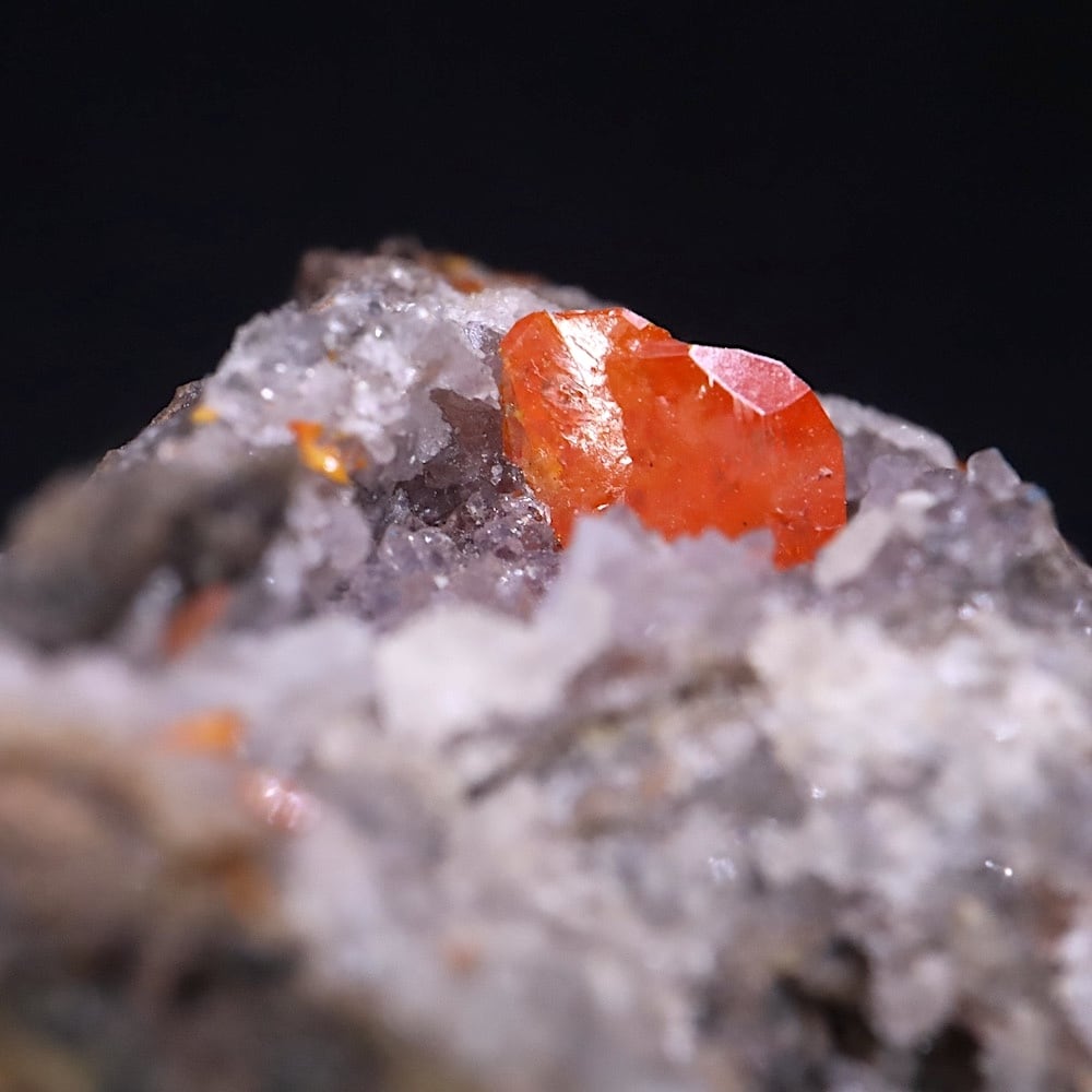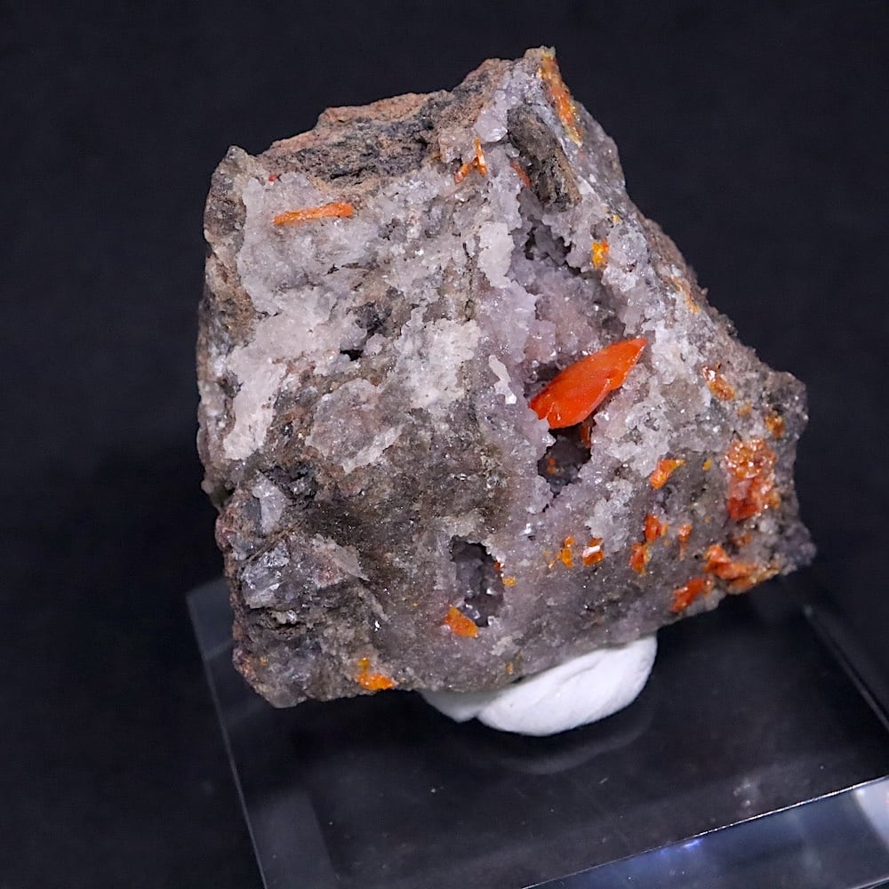 キラキラ光るクォーツにより鮮やかなオレンジのウルフェナイト結晶が