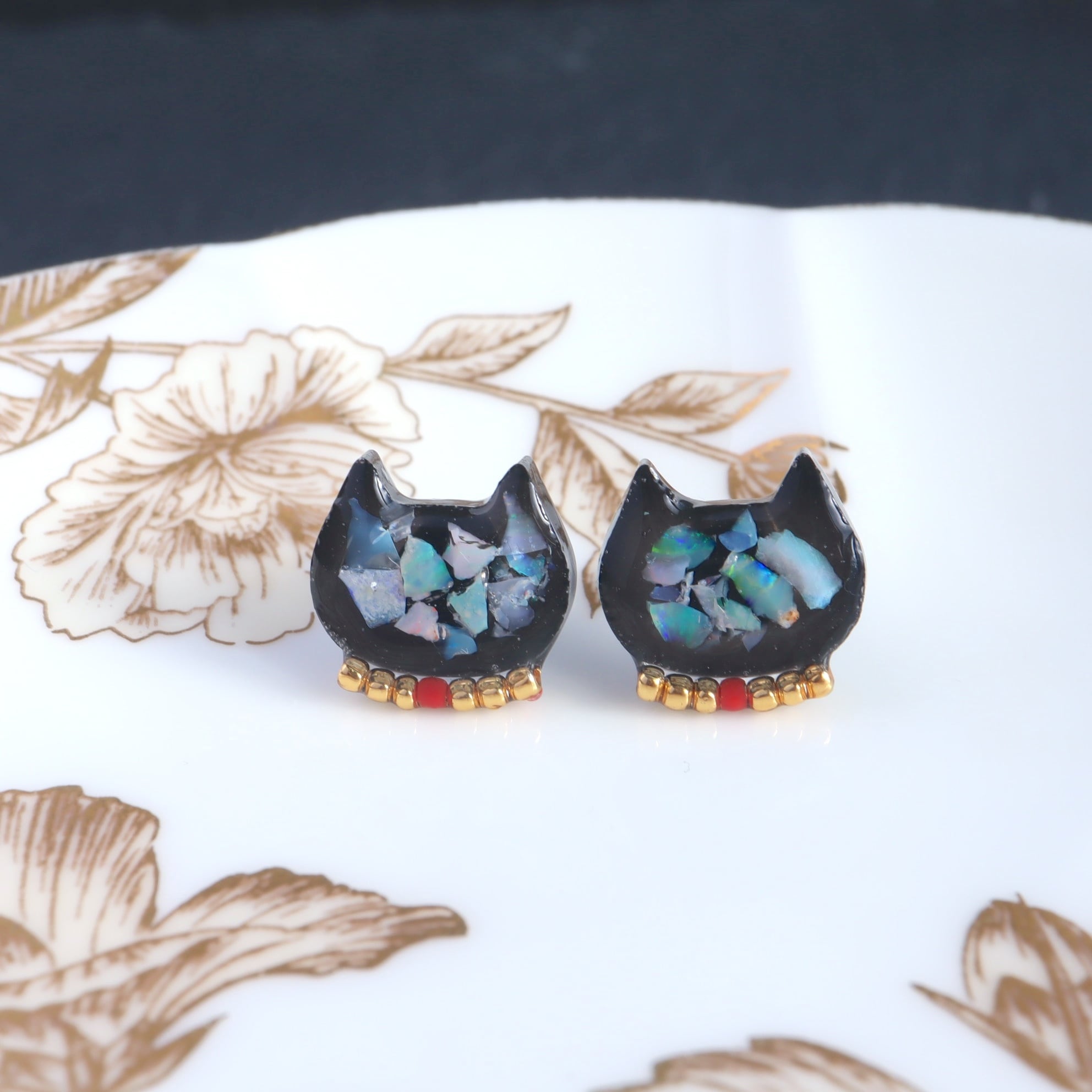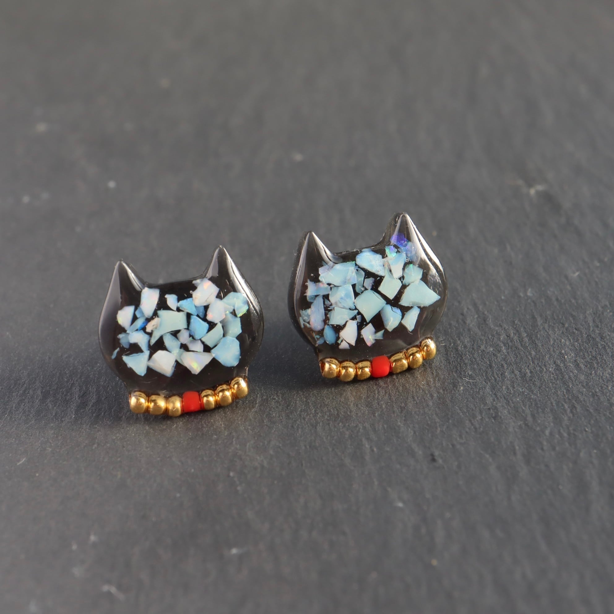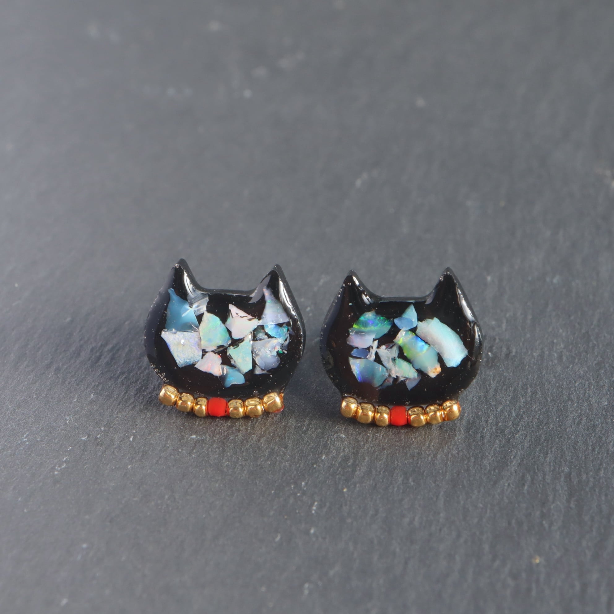 オパール にゃんこ 猫 BLACK ピアス ブラック 天然石 原石