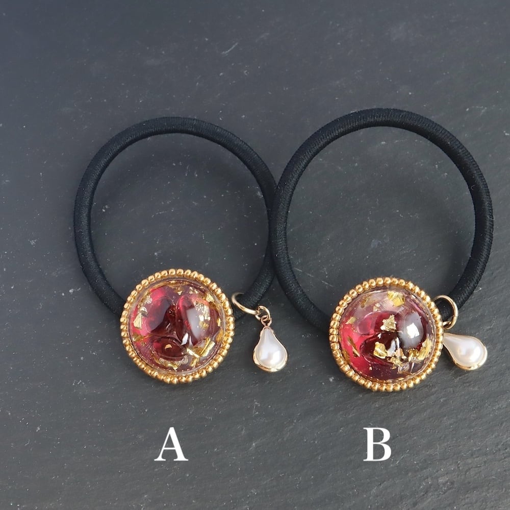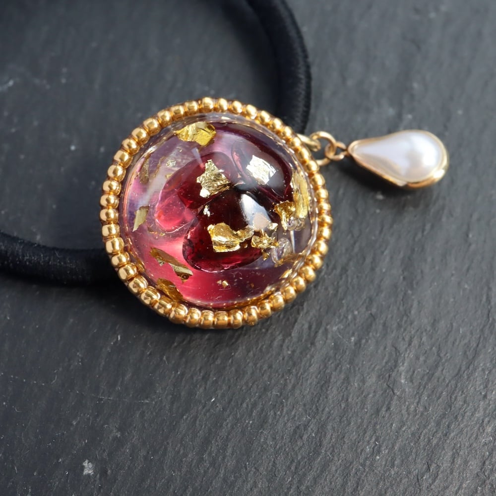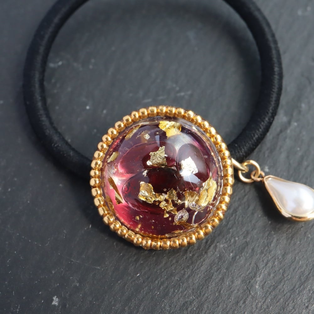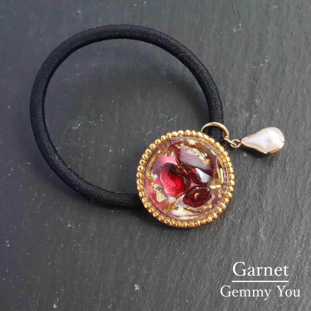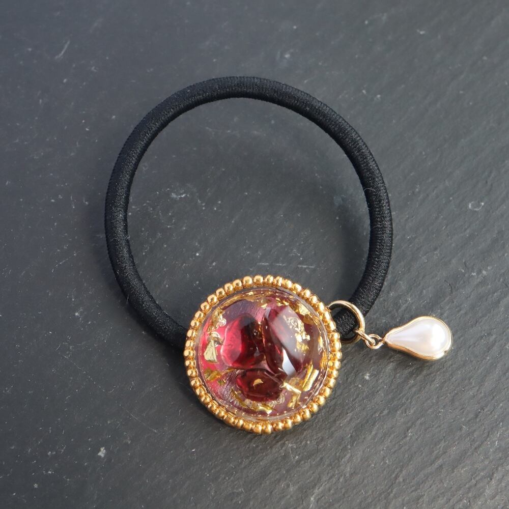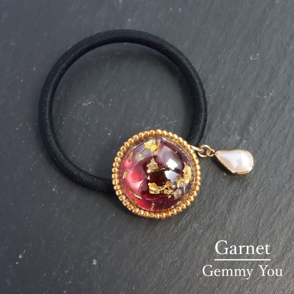 素材: ガーネット、金箔、レジン樹脂、ビーズ、ヘアゴム