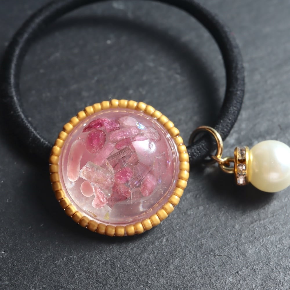 ピンク トルマリン 【石のきもち】 レジン ヘアゴム 茶 アンティーク マットゴールド 天然石 誕生石